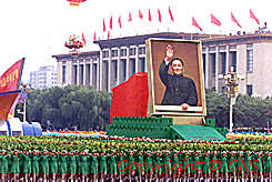 10月1日在北京舉行的首都各界慶祝中華人民共和國成立50周年大會群眾游行隊伍中,出現了鄧小平的巨幅畫像。作者:趙偉