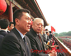 香港特區(qū)首任行政長官董建華(左二)、澳門候任行政長官何厚鏵(左一),十月一日在天安門城樓上觀禮國慶大典。(本社記者天安門城樓數(shù)碼傳真)作者:李剛