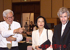 全國政協副主席、“21世紀論壇”2000年會議組委會副主席羅豪才(左)16日在會議休息時,與北京大學國際關系研究所所長袁明(中)、英國劍橋大學“中國管理辦公室”高級經濟學家諾倫在一起談笑風生。中新社記者:李剛