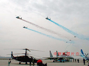 為期七天的第三屆中國國際航空航天博覽會六日在珠海隆重開幕。來自歐、美、亞、非二十七個國家和地區的八十九架各式軍用、客用、貨運飛機向現場觀眾做精彩飛行表演和靜態展示。圖為中國某部陸軍航空兵的直升機進行編隊飛行。中新社圖 蕭琨 攝