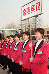 北京各賓館的禮儀小姐三月一日到機場迎接參加“人大”、“政協”會議的代表和委員們。作者:王麗南