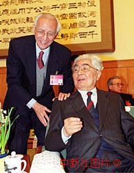 三日出席全國政協九屆三次會議的榮毅仁與全國政協副主席經叔平在會上交談。作者:宗金柱