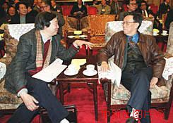 作家王蒙與馮驥才在政協(xié)開(kāi)幕大會(huì)上交談