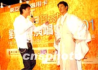 亞洲樂壇巨星劉德華30日在時代廣場為其蠟像揭幕時,擁吻蠟像館外籍女工作人員,令其開心不已。中新社傳真洪少葵攝