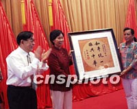 歐美同學(xué)會(huì)副會(huì)長(zhǎng)、全球華人反獨(dú)促統(tǒng)聯(lián)盟副會(huì)長(zhǎng)李勁祥先生(左一)18日在贈(zèng)送把一九九三年蔣緯國(guó)先生親贈(zèng)與他的“和平統(tǒng)一、振興中華”的手書(shū)復(fù)制件贈(zèng)送海南向宋氏祖居基金會(huì)。中新社圖 王辛莉 攝