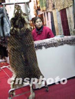 中國(guó)皮草業(yè)正在為“保護(hù)野生動(dòng)物”而自律。十六日在北京開(kāi)幕的中國(guó)國(guó)際裘皮革皮制品交易會(huì)上,河北蠡縣硝染廠以犬皮染制的“金錢豹”皮毛制品幾可以假亂真。中新社記者 鄒憲 攝