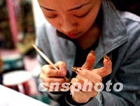 一位女孩二十四日在北京華威商城的“美甲”店,學(xué)習(xí)為假指甲描畫(huà)花紋。現(xiàn)代的北京女孩不僅經(jīng)常光顧美容院進(jìn)行皮膚護(hù)理,而且日益視指甲的護(hù)理與修飾為時(shí)尚。中新社圖 劉殊瑾 攝
