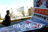一位市民二十一日經過中國人民銀行北京總部前的一個報攤。為了克服世界經濟增長持續放緩對中國經濟發展帶來的不利影響,保持中國國民經濟持續、快速、健康發展,中國人民銀行今起再次下調人民幣存、貸款利率。中新社圖 武仲林 攝