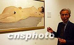 中國畫壇大師吳冠中藝術里程展覽三月十四日在香港藝術館舉行。圖為中國畫壇大師吳冠中向觀眾介紹他的部分作品。中新社圖 任海霞 攝