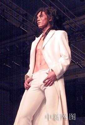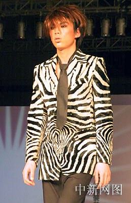 2002-2003秋冬中國服裝流行趨勢發(fā)布周昨晚在北京中國大飯店舉行。首場“昂斯”男裝專場表演突破以往設(shè)計風(fēng)格,以高雅的正裝;糅合了運動和流行音樂元素的街頭裝扮等展現(xiàn)了風(fēng)格迥異的時尚男裝。圖為男模展示以黑、白、灰三色系為主的男裝。