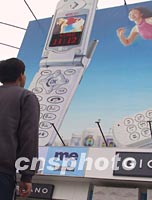近日,在北京王府井的街頭立起了一塊用手機廣告裝飾的時間牌,它可以顯示時間和溫度,給行人帶來方便。手機廠商為了搶占手機市場可謂煞費苦心。中新社記者 杜洋 攝