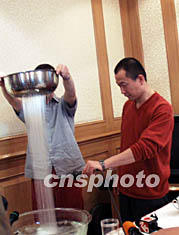 剛剛獲得格萊美獎的知名音樂家譚盾十七日現身滬上,并帶來了他獨特的“多媒體音樂”。圖為譚盾通過自己發明的半球形透明水盆,和外國音樂家一起演奏《永恒之水協奏曲》。孫璐 攝