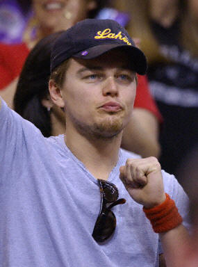 5月26日美國演員萊昂納多在NBA西區決賽上為洛杉磯湖人隊歡呼。湖人隊以100-99戰勝國王,雙方總比分戰成2比2平。法新供中新
