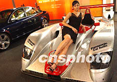 一名黑衣模特躺在身經(jīng)百戰(zhàn)的銀色賽車上,使北京六月的國際汽車展富于美女名車的剛?cè)嶂椤YZ國榮 攝