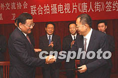 中國海外交流協會和香港鳳凰衛視二十一日在北京舉行關于聯合拍攝電視片《唐人街》簽約儀式。圖為中國海外交流協會副會長劉澤彭(右)與鳳凰衛視董事局主席劉長樂在簽約儀式上。作者:武仲林