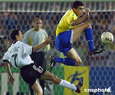 6月30日2002韓日世界杯決賽巴西與德國隊的決賽在日本橫濱國際競技體育場進行,上半場比分為0:0。圖為巴西隊盧西奧騰空躍起阻擋德國前鋒諾伊維爾。