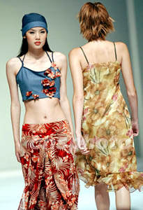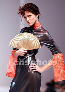 香港模特7月9日在香港舉行的「香港時(shí)裝節(jié)春夏系列2003」上,演繹臺(tái)灣設(shè)計(jì)師林心泙設(shè)計(jì)的中國(guó)傳統(tǒng)服飾。洪少葵 攝