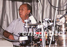 繼美、德等國科學家之后,中國科學家今年也成功實現(xiàn)了愛因斯坦七十年前預言的新物態(tài)——“玻色—愛因斯坦凝聚”實驗。圖為領導這一項目的中國科學院院士王育竹日前在上海實驗室介紹該項實驗。中新社記者 孫自法 攝