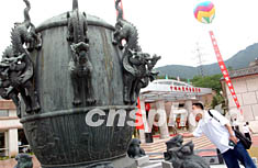 “七.二八”唐山大地震二十六周年紀念日前夕,中國首家專業地震科普教育館二十七日在北京開館。圖為一參觀者在展館外以一比一復原的“張衡地動儀”前駐足。作者:武仲林