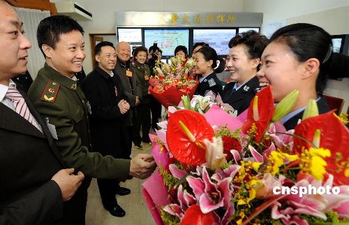 3月8日,國際婦女節,出席十一屆全國政協會議的部分文藝界政協委員來到北京人民大會堂交通指揮所,向為兩會服務的女交警們獻上鮮花,表達節日的祝賀。中新社發 劉英毅 攝