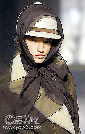 沙礫般的金屬色領巾系成夸耀的大蝴蝶結,正好配襯皮草大衣的華麗,而拼接在金色領巾上的黑色薄紗則增加了幾分收斂的柔軟感覺。