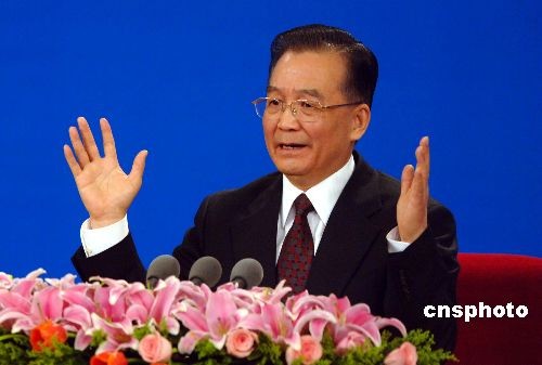 3月18日上午,十一屆全國人大一次會議在北京人民大會堂閉幕,國務院總理溫家寶于會后率李克強、回良玉、張德江、王岐山四位副總理會見中外記者。圖為溫家寶總理答記者問。中新社發 王東明 攝