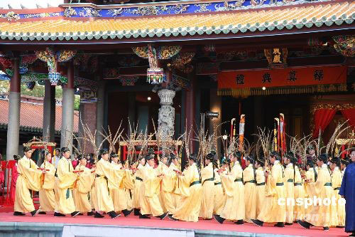 十月五日舉行的臺北祭孔大典與往年不同,佾舞及雅樂演出由六佾變為八佾,即由六行六列三十六名佾生,增加到八行八列六十四名佾生。中新社發 楊旭 攝