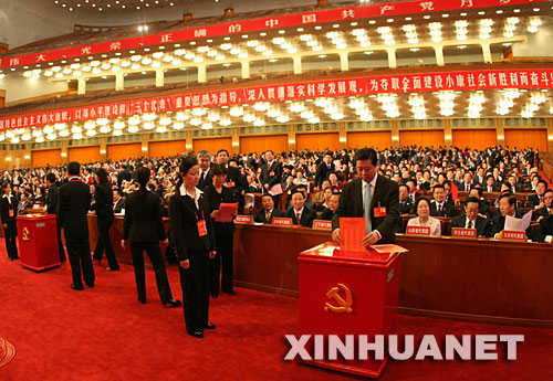 新華網(wǎng)十七大快訊:現(xiàn)在開始投票,總監(jiān)票人、監(jiān)票人首先投票。