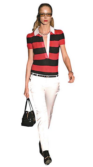 一直以來走性感路線的BottegaVeneta在2006年春夏推出了搶眼的紅白條紋短裝,具有線條感的豎條紋束胸式上衣包裹了女士們上半身的美好曲線,而下半身搭配一件紅白相間的條紋短褲,既富有動感又顯得性感迷人。Gucci也以紅黑搭配的條紋打造了現代都市女性的風采,深V領的紅黑條紋T恤搭配一件剪裁良好的白色長褲,行走于都市街頭,展現出一種獨特的英姿。