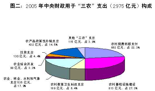 (二)大力支持解決“三農(nóng)”問題,促進城鄉(xiāng)協(xié)調(diào)發(fā)展。2005年財政支持“三農(nóng)”繼續(xù)保持了力度大、政策實、措施強的特點。全年僅中央財政用于“三農(nóng)”的支出就達2975億元,比2004年實際執(zhí)行數(shù)增加349億元,增長13.3%。一是不斷深化農(nóng)村稅費改革。中央財政為此轉(zhuǎn)移支付662億元,比2004年增長26.3%。2005年,牧業(yè)稅和除煙葉外的農(nóng)業(yè)特產(chǎn)稅已全部免征;免征農(nóng)業(yè)稅的省份達到28個,8億農(nóng)民受益。二是認真落實“三補貼”等政策。全國30個省份用于糧食直補的資金達到132億元,比2004年增長13.8%。兌付良種補貼資金38.7億元,比2004年增長35.8%。中央財政兌付農(nóng)機具購置補貼資金3億元,是2004年的4倍多。另外,落實專項資金55億元,對產(chǎn)糧大縣予以財力補助;對企業(yè)生產(chǎn)銷售的尿素免征增值稅,運用關(guān)稅政策鼓勵進口國內(nèi)短缺的農(nóng)業(yè)生產(chǎn)資料。調(diào)動了地方政府重農(nóng)抓糧的積極性,維護了糧食安全。三是支持農(nóng)業(yè)和農(nóng)民長遠發(fā)展。2005年中央財政用于農(nóng)業(yè)農(nóng)村基礎(chǔ)設施建設的預算內(nèi)基本建設投資和國債項目資金達812.78億元,進一步改善了農(nóng)村生產(chǎn)生活條件。中央財政用于農(nóng)業(yè)綜合開發(fā)資金98.55億元,新增資金中76.6%用于糧食主產(chǎn)區(qū)中低產(chǎn)田改造的農(nóng)業(yè)基礎(chǔ)設施建設。同時,積極探索采用投資參股、專項貼息等形式,更加有效地發(fā)揮農(nóng)業(yè)綜合開發(fā)資金的引導、示范和帶動效應。中央財政支持280萬農(nóng)村勞動力轉(zhuǎn)移培訓,補助資金4億元,比2004年增長60%。不斷增加用于扶貧開發(fā)方面的投入,2005年達到130億元。中央財政安排資金251.7億元,直接補貼退耕還林的農(nóng)民。繼續(xù)大力支持農(nóng)業(yè)科技推廣、農(nóng)業(yè)產(chǎn)業(yè)化、農(nóng)民專業(yè)合作組織發(fā)展、小型農(nóng)田水利建設和測土配方施肥等。