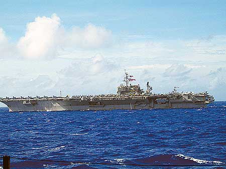 6月17日下午,來自中國、澳大利亞、印度、日本、韓國、俄羅斯、新加坡等7個國家的觀摩團分為3個小組,分別乘坐運輸機前往關島附近海域參觀美軍“里根”號、“林肯”號和“小鷹”號航空母艦。