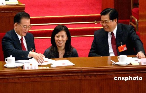 三月十五日上午,十一屆全國人大一次會議第五次全體會議在北京人民大會堂舉行。圖為會議進行投票間隙,胡錦濤(右)、溫家寶(左)與奧運冠軍楊揚在主席臺上交談。中新社發 王東明 攝