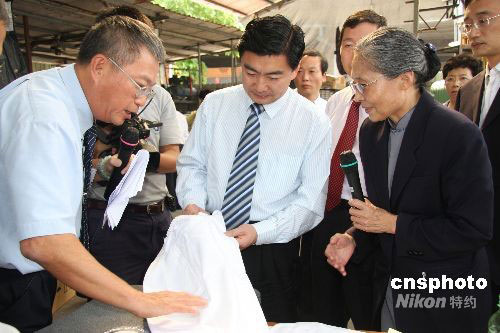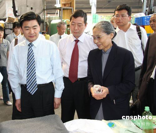 中共江蘇省委常委、蘇州市委書記王榮率領(lǐng)蘇州市副市長及太倉市副市長一行抵達(dá)臺灣參訪。十月一日下午,王榮一行參觀慈濟(jì)在臺北市八德路的環(huán)保教育站。慈濟(jì)的義工請王榮觀看她們用手中回收的這種塑料瓶加工制作的衣物和毯子,這些再利用的物品曾捐助四川地震災(zāi)區(qū)。中新社發(fā) 耿軍 攝