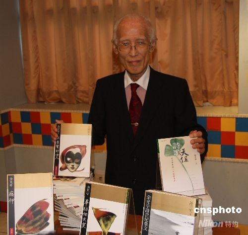 為祝賀詩人余光中八十大壽,臺(tái)灣九歌出版社特意出版余光中最新詩集《藕神》、近十年的文學(xué)評(píng)論精選《舉杯向天笑》、翻譯英國(guó)名作家王爾德的劇本《不要緊的女人》等五本書,展現(xiàn)他在文學(xué)路上的成就。十月二日,臺(tái)灣藝文界提前為他祝壽,余先生在五本新書前留影。中新社發(fā) 耿軍 攝
