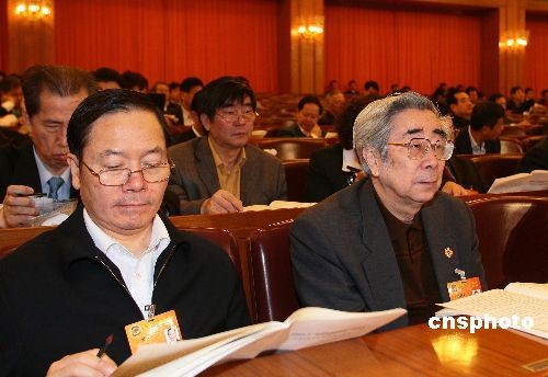 三月八日上午,全國政協十一屆一次會議第二次全體會議在北京人民大會堂舉行,民政部副部長羅平飛和原廣播電影電視部法規司副司長、魯迅之子周海嬰(右)參加會議。中新社發 盛佳鵬 攝