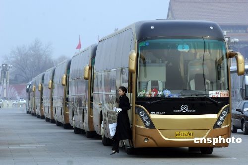 2008年3月8日,停在北京天安門廣場、全國政協(xié)十一次會議會場外的環(huán)保節(jié)能大巴。據(jù)悉,這種平均百公里油耗不到5升的環(huán)保大巴是首汽首次為“兩會”代表團提供服務(wù)。此外,為營造奧運年氣氛,“兩會”服務(wù)車的內(nèi)前擋風(fēng)玻璃下方都擺放了北京奧運會吉祥物福娃。中新社發(fā) 張朋 攝