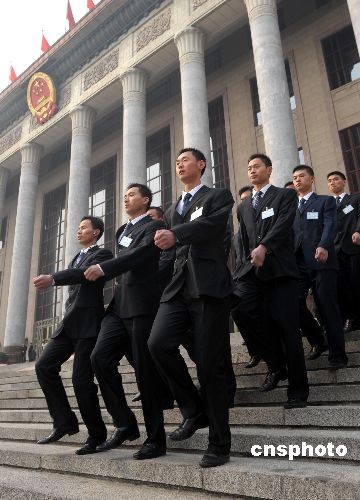 三月八日,全國政協(xié)十一屆一次會議第二次全體會議在北京人民大會堂舉行。會議結(jié)束后,身穿深色西服的工作人員整齊列隊(duì)走下大會堂的高臺階。中新社發(fā) 廖攀 攝