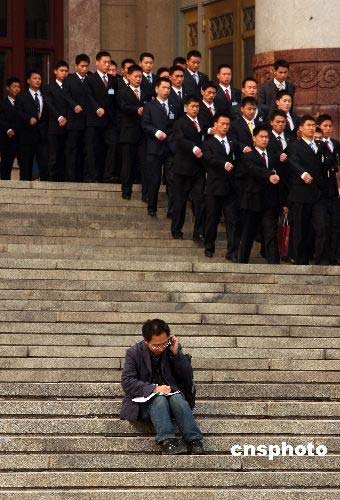 三月八日上午,全國政協(xié)十一屆一次會議第二次全體會議在北京人民大會堂舉行,十四位政協(xié)委員圍繞經(jīng)濟建設(shè)和社會建設(shè)等問題作大會發(fā)言。會后,一名忙碌的記者坐在臺階上與列隊而出的兩會服務(wù)人員相映成趣。中新社發(fā) 盛佳鵬 攝