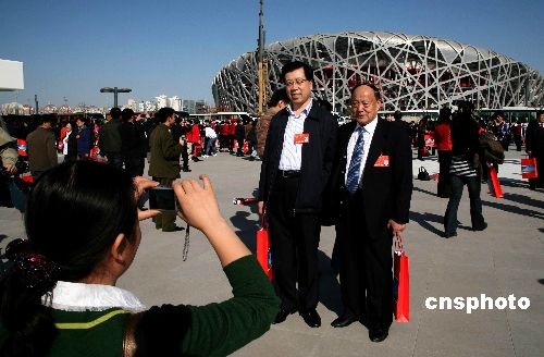 3月13日下午,出席全國人大會的部分代表利用休息時間參觀奧運場館。中新社發 王輝 攝