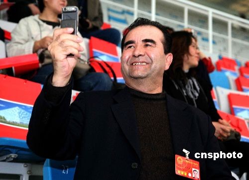 在國家游泳館,來自新疆代表團的努爾拉·阿尤甫代表在用手機拍攝“水立方”場內景。