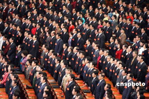3月18日上午,十一屆全國人大一次會議在北京人民大會堂閉幕,全體代表起立,高唱國歌。中新社發 張宇 攝