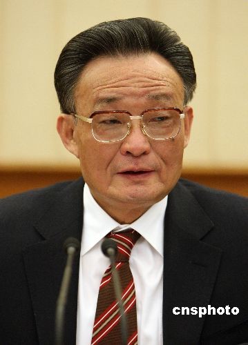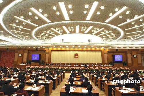 第十一屆全國人民代表大會常務委員會第一次會議3月19日上午在北京人民大會堂舉行,會議通過任命王萬賓、喬曉陽、張少琴、曹衛洲、王慶喜、李連寧、何曄暉(女)、孫偉、劉振偉為全國人民代表大會常務委員會副秘書長,吳邦國委員長發表講話。中新社發 任晨鳴 攝