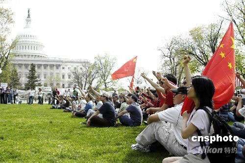 當(dāng)?shù)貢r(shí)間4月19日,近千名中國(guó)留學(xué)生和當(dāng)?shù)氐娜A僑華人在美國(guó)國(guó)會(huì)山前舉行示威活動(dòng),支持北京奧運(yùn),反對(duì)CNN丑化中國(guó)的評(píng)論。圖為千名留學(xué)生在國(guó)會(huì)山前振臂高呼:“不要歪曲報(bào)道!不要支持暴力!支持和平,支持奧運(yùn)!” 中新社發(fā) 邱江波 攝