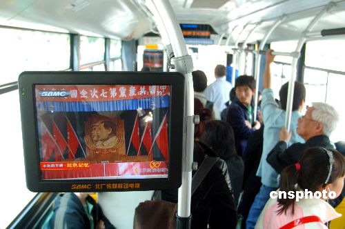 10月21日,北京公共汽車上的電視屏幕播放中共七大的紀錄影片。當日,中共十七大完成各項議程后在北京人民大會堂閉幕。中新社發 廖攀 攝