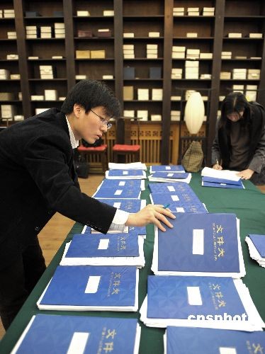 全國政協十一屆一次會議委員提案接收工作于三月九日下午兩點截止,據統計,共收到委員提案4772件。圖為大會提案組辦公室工作人員在清點提案。中新社發 廖攀 攝