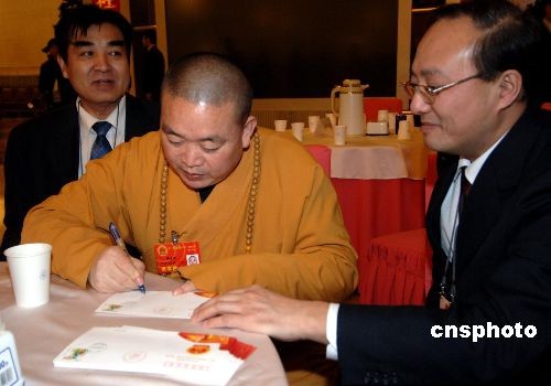 全國兩會召開期間,全國人大代表、少林寺方丈釋永信成為會上引人注目的明星,經(jīng)常有媒體采訪和代表委員求簽名。圖為他在給代表簽名兩會紀念郵票首日封。中新社發(fā) 王東明 攝
