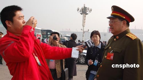 3月10日,十一屆全國人大一次會議在北京人民大會堂舉行第三次全體會議。一名記者在會場外的天安門廣場抓住一名解放軍中將采訪,因為機會難得,一手拿話筒、一手握相機著實忙活。中新社發 劉萬強 攝