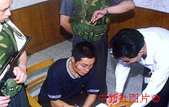 重慶警方9月19日晚21時50分在重慶渝中區觀音巖捕獲渝、湘、鄂系列槍支搶劫案首犯張君。圖為張君被捕獲后接受警方審問。中新社圖片 作者:石智勇