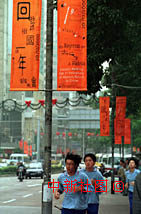 澳門新口岸馬路燈柱上裝飾出澳門回歸字樣條幅,為即將迎來回歸一周年的澳門街頭增添了節日氣氛。中新社記者 滿會喬 攝