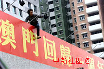 圖文:澳門很多建筑物懸掛起回歸一周年慶祝標語